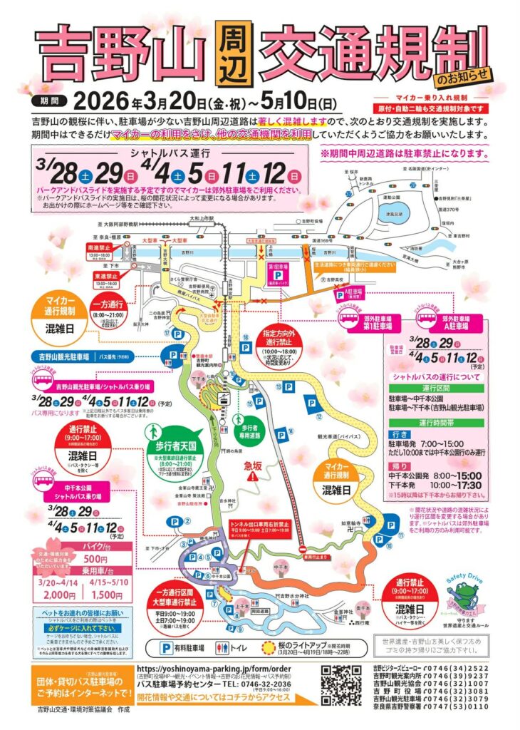 観桜期の吉野山周辺交通規制のお知らせ 2026年3月6日 by Admin_kanri2022 3月20日~5月10日、吉野山周辺で交通規制が行われます。 吉野山の観桜に伴い、駐車場の少ない吉野山周辺道路は著しく混雑いたします。 期間中、吉野山にお越しの際は、出来るだけマイカーの利用をさけ、他の交通機関を利用していただくよう、ご協力をお願いいたします。